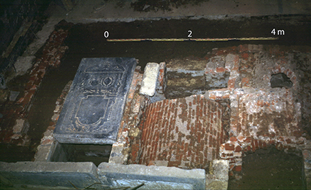 Lors des travaux de restauration de l’église par la Ville de Bruxelles, le dallage fut entièrement déposé. Des ossements humains, des pierres tombales et des caveaux funéraires apparurent. Marcel Célis, représentant la Commission royale des Monuments et des Sites, obtint du maître d’ouvrage que la cellule de fouilles de la Société Royale d’Archéologie de Bruxelles puisse effectuer, en urgence, des sondages archéologiques dans le sous-sol. La fouille permit notamment l’examen plus ou moins détaillé de caveaux dont, en particulier, un groupe situé sous le chœur et qui se distingue par la diversité de mise en œuvre de tels ouvrages au XVIIIe siècle (voir photo).